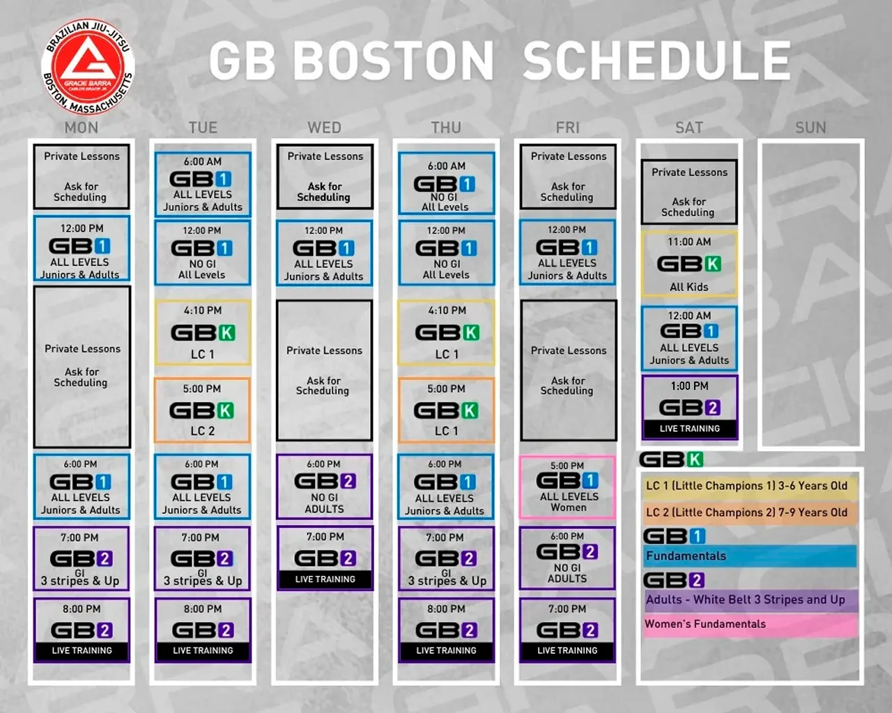 At Gracie Barra Boston, we offer classes six days a week to fit your busy lifestyle. Whether you’re a beginner or advanced, our expert instructors guide you through Brazilian Jiu-Jitsu training designed to build confidence, fitness, and skills. Join us Monday through Saturday and find the perfect class time that works for you. Come train with a supportive community dedicated to your growth both on and off the mats.
